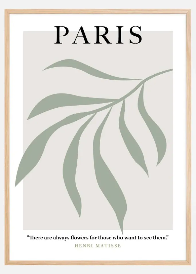 Denne stilfulde og elegante plakat har ordet “PARIS” i store bogstaver, over en baggrund af blødt grønne linjer, der danner en abstrakt, organisk form, der minder om rolige og kølige haver. Dens afdæmpede palette giver en følelse af fred og subtil elegance, hvilket afspejler byens ry som et centrum for skønhed og kultur. Den kompletteres af et inspirerende citat af Henri Matisse, hvilket giver plakaten en dybde af kunstnerisk visdom: “There are always flowers for those who want to see them.”