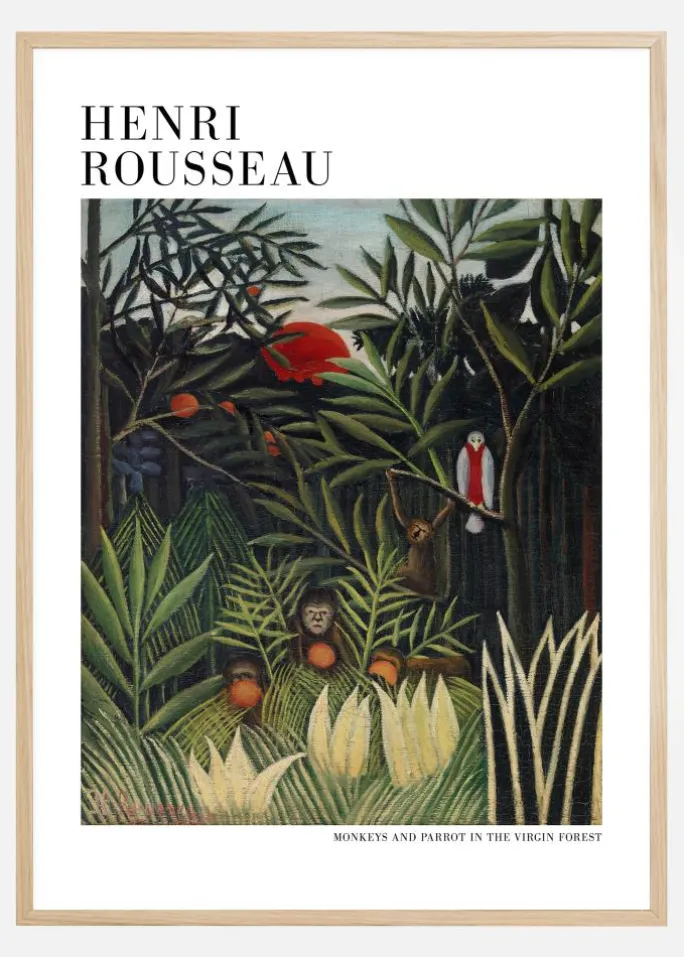 Mærk roen og den fortryllede atmosfære, som denne plakat formidler. Motivet inviterer beskueren til en stille verden bortom det almindelige, hvor man kan forundres over de små detaljer i Rousseaus værk. Måden, hvorpå de sorte konturer fremhæver hvert element, fra de smilende abers ansigtsudtryk til papegøjens islæt af klar rød og hvid, gør dette print til et must for samlere og dyreelskere. Dette billede er ikke blot en visuel nydelse, men også en samtalestarter, der garanteret vækker interesse og nysgerrighed hos dine besøgende.