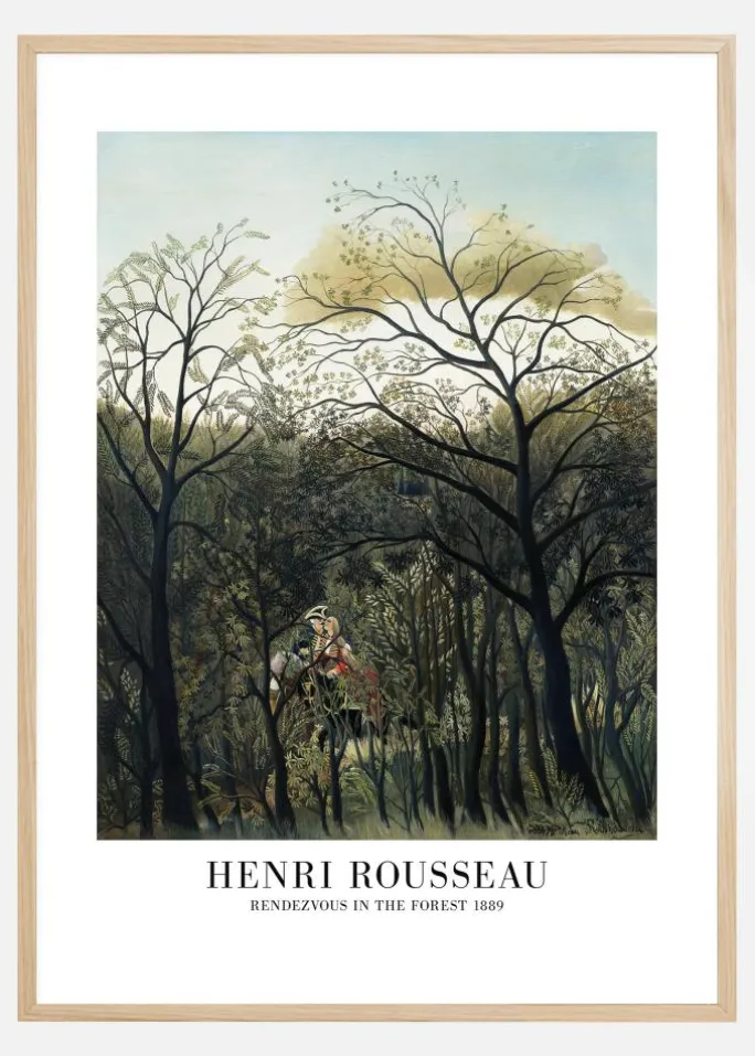 Denne betagende plakat med titlen ‘Rendezvous i Skoven’ fra 1889 er et værk af Henri Rousseau, der fanger et hemmeligt møde i den frodige skov. Perfekt for dem, der søger et kunsttryk, der både er klassisk og mystisk, skildrer billedet en sjælden scene, hvor en figur i rød dragt ser ud til at smelte sammen med den omgivende vegetation. De vigtigste farver i dette stykke er en symfoni af grønt, varierende fra dyb mos til bløde, blege toner, der supplerer hinanden og giver en følelse af dybde og dimension til skovmiljøet. Luftige nuancer af beige og blå åbner himlen og giver indtryk af et vidtstrakt landskab, der er både fredeligt og indbydende.