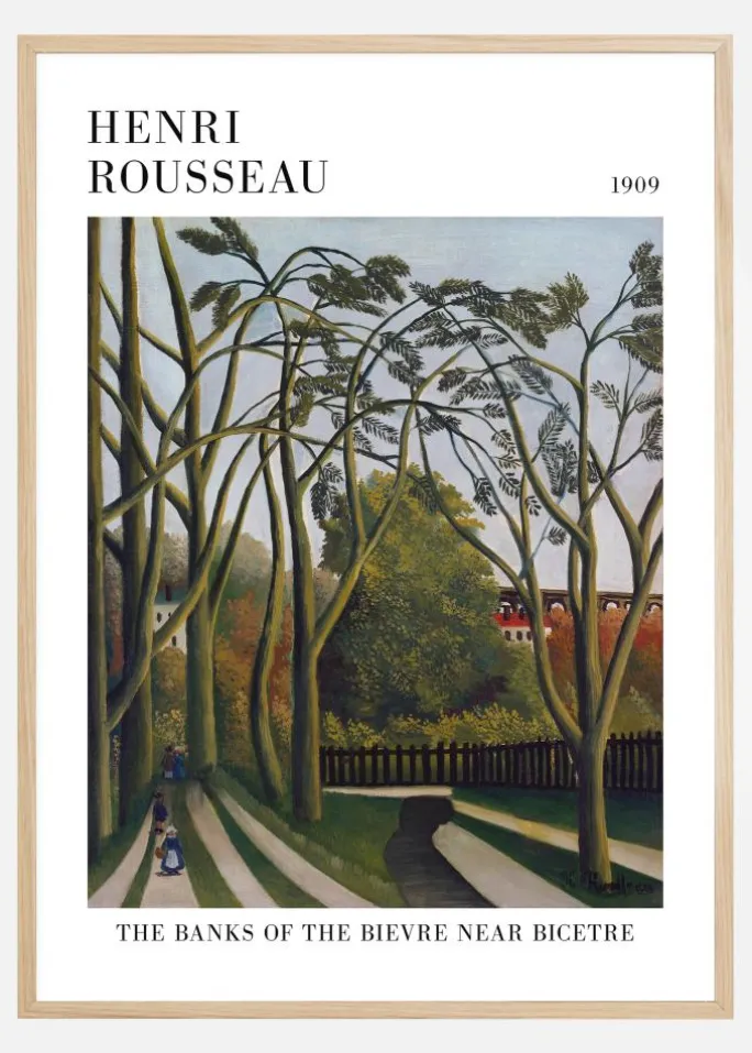 Denne beroligende plakat med titlen ‘The Banks of the Bièvre near Bicêtre’ malet af Henri Rousseau i 1909 tilbyder en fredelig udsigt over landskabet ved Bièvres flodbredder. Med en harmonisk palette, der afspejler overgangen fra sommer til efterår, viser dette print naturens skønhed gennem de dansende træer med deres slanke stammer og fjeragtige løv i forskellige grønne nuancer. Den stille scene er gennemsyret af bløde himmelblå og varme efterårsfarver i gul, orange og rød, hvilket forherliger de skiftende blades farver og skaber en atmosfære af fred og ro. Denne kunstprint er et fantastisk supplement for den, der ønsker at indrette sit hjem med en følelse af naturens stilhed og skønhed.