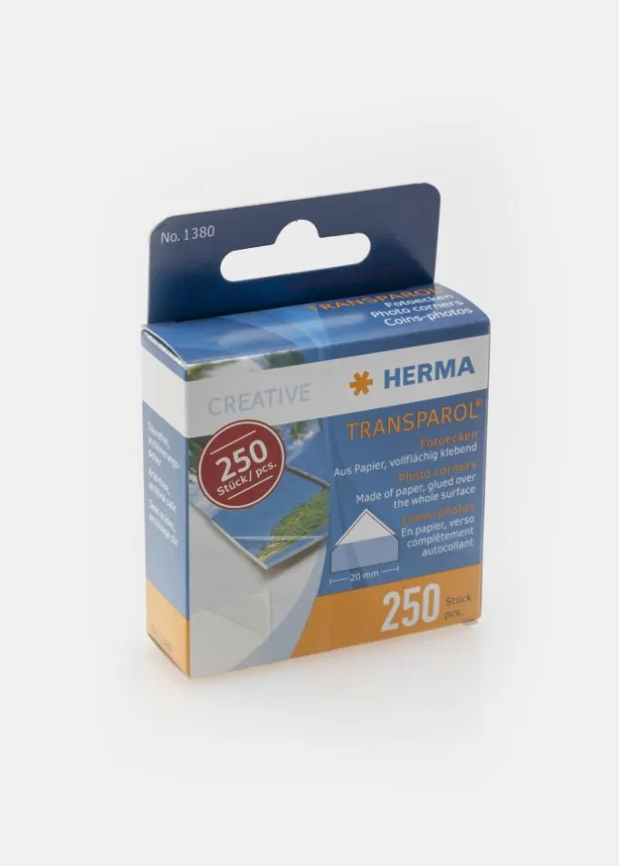 Selvhæftende gennemsigtige fotohjørner fra Herma. Hver pakke indeholder 250 stk fotohjørner. Bruges bl.a. til at montere billeder i fotoalbummer. Hvert fotohjørne har en bredde på 20 mm.