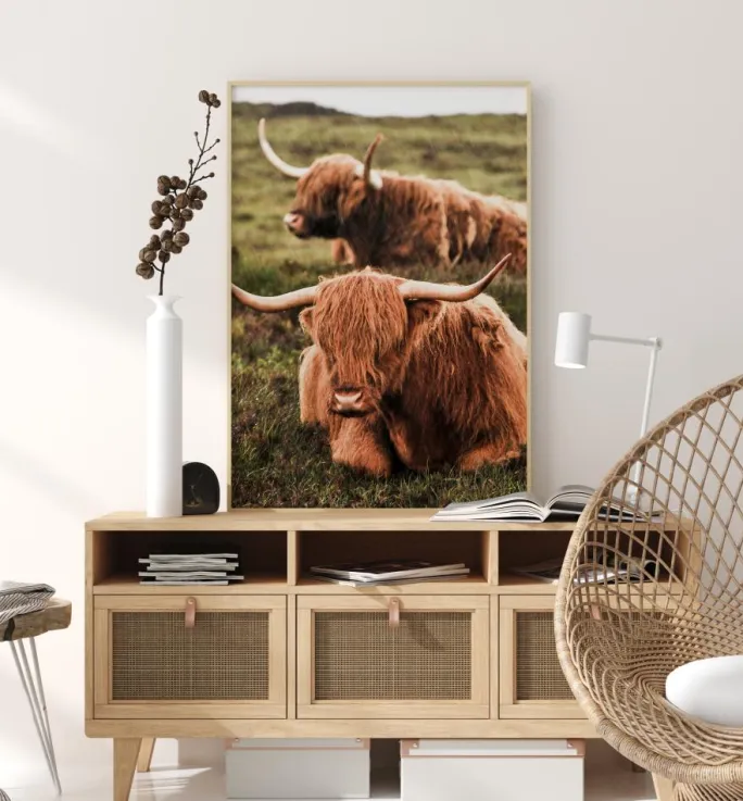 Et naturligt print af højlandskvæg. Disse højlandskøer hviler sig på heden og viser deres smukke rødhårede pels frem. Med deres karakteristiske horn og lange pels nyder de deres tid med at slappe af på den kolde skotske hede. Få dette smukke naturtryk ind i dit hjem.