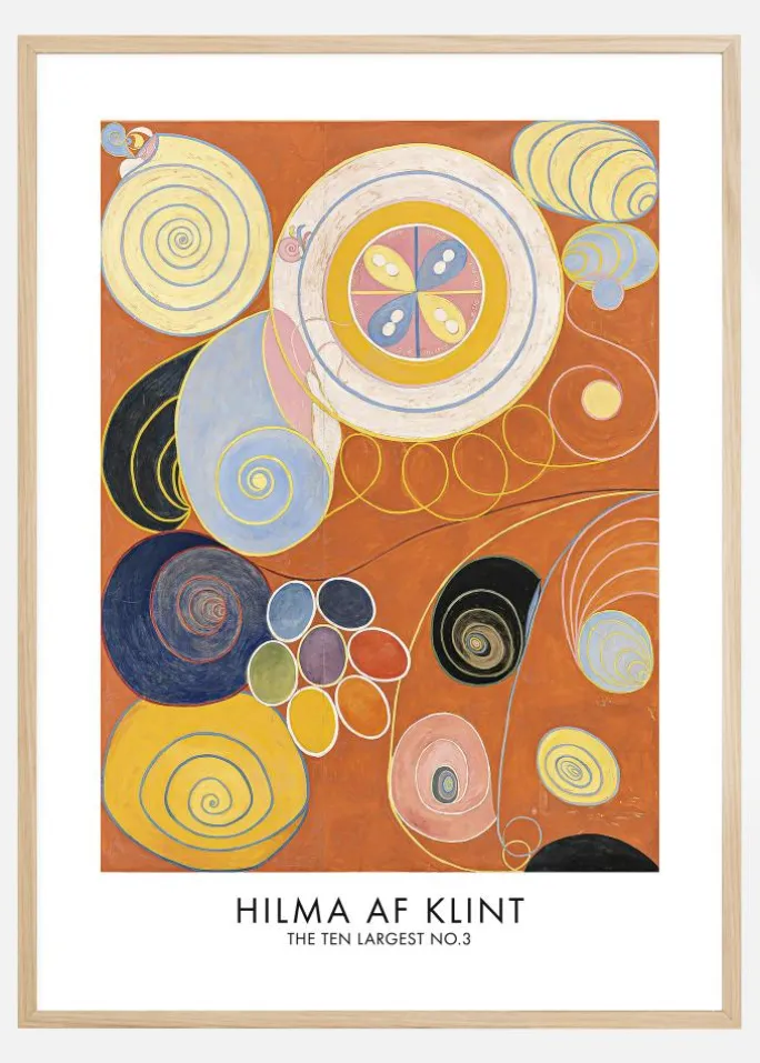 Denne fortryllende plakat viser ‘The Ten Largest No.3’, et kunstværk af Hilma af Klint, fyldt med liv og bevægelse gennem dets spiral- og cirkelformer. Med en baggrund i varme toner af orange og rød er plakaten oplyst af spiraler i nuancer af blå, gul og sort, og punkteres af bløde pasteller. Disse former og farver synes at svæve frit på lærredet, hvilket giver en følelse af kosmisk orden og mystisk rytme. Denne print er en repræsentation af af Klints evne til at formidle en dybere, ukendt verden gennem sine abstrakte kompositioner og er en vidunderlig indretningsdetalje for alle, der elsker kunst, som udfordrer og inspirerer.