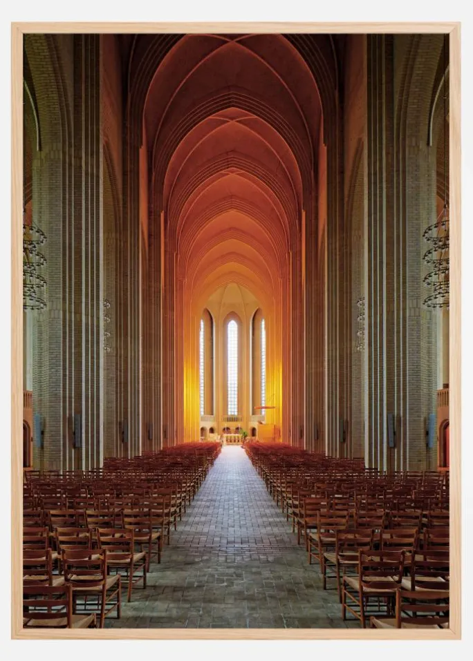 Et betagende arkitektonisk print inde i en kirke. Den lange gang, der fører op til alteret, det høje loft og stensøjlerne giver en meget fredfyldt følelse. Det lyse orange lys, der reflekteres gennem vinduerne, skaber en følelse af varme og harmoni. Føl freden og roen i dette print.