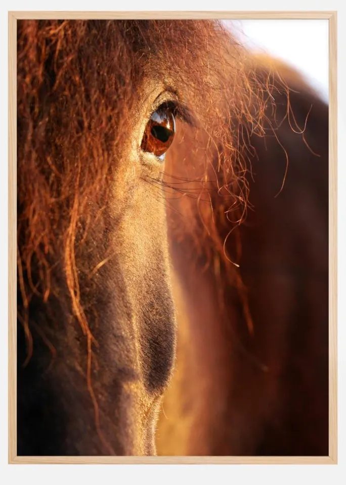 En vildtplakat af en kastanjefarvet hest. Dette nærbillede fremhæver dette dyrs smukke farver. Et nærbillede af hestens øje er næsten dækket af dens lange manke. Nyd dette dyrs skønhed, hver gang du kigger på dette print.