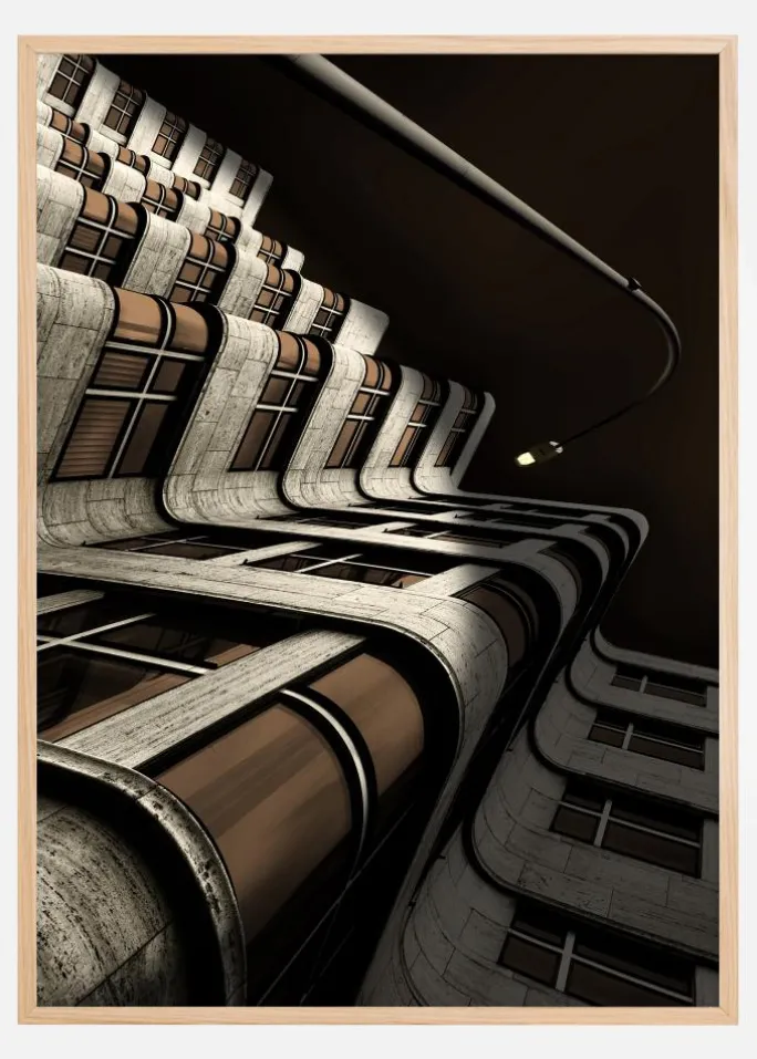 Denne suggestive og dynamiske plakat fanger en usædvanlig vinkel af en urban skyskraber om natten, hvor linjespillet og arkitekturen skaber en næsten surrealistisk scene. De oplyste vinduer og de bløde kurver mod den mørke himmel tilbyder en varm kontrast, der giver billedet dybde og perspektiv. Den unikke komposition giver en følelse af bevægelse og modernisme, hvilket gør denne plakat til et iøjnefaldende element i alle rum.