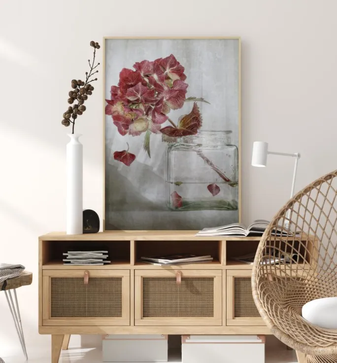 Et smukt naturprint af en enkelt stængel af hortensia i en gennemsigtig vase. Foran et blomstret hvidt gardin falder et sart lyserødt kronblad. Både en let vind og gardinet blæser. Mærk den kølige brise i dette billede.