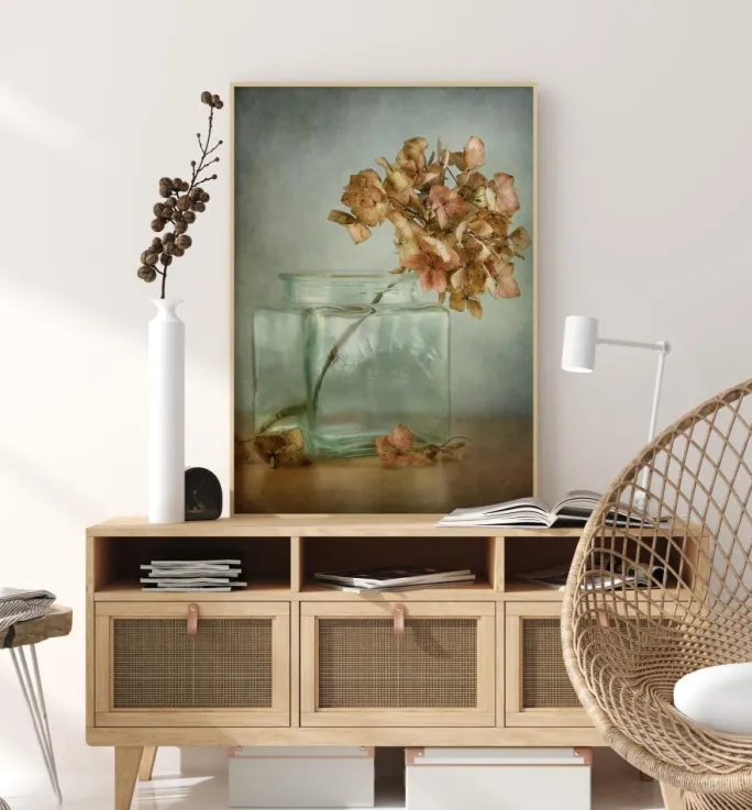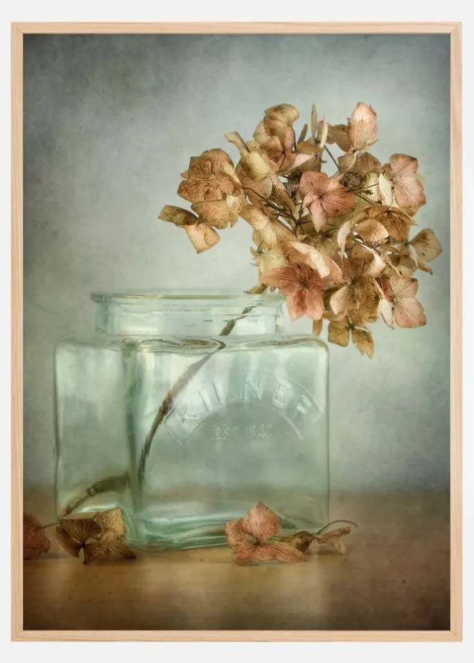 Et smukt naturprint af en enkelt stængel af hortensia i en gennemsigtig vase. Foran et blomstret hvidt gardin falder et sart lyserødt kronblad. Både en let vind og gardinet blæser. Mærk den kølige brise i dette billede.