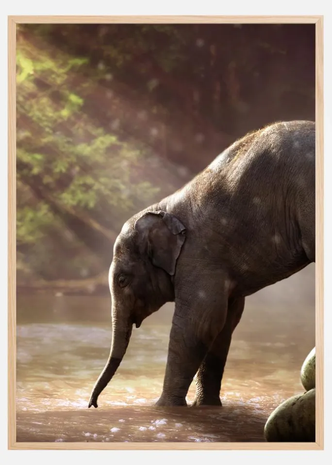 Et sødt foto af en elefantunge, der bliver opfordret til at gå i floden af sin mor. Dagslyset skinner gennem træerne og reflekteres på vandet, hvilket skaber en følelse af varme.Tøvende over for at gå i vandet skubber moderen forsigtigt sin baby væk fra klipperne. Et sødt print, der afspejler den intense kærlighed mellem mor og barn.