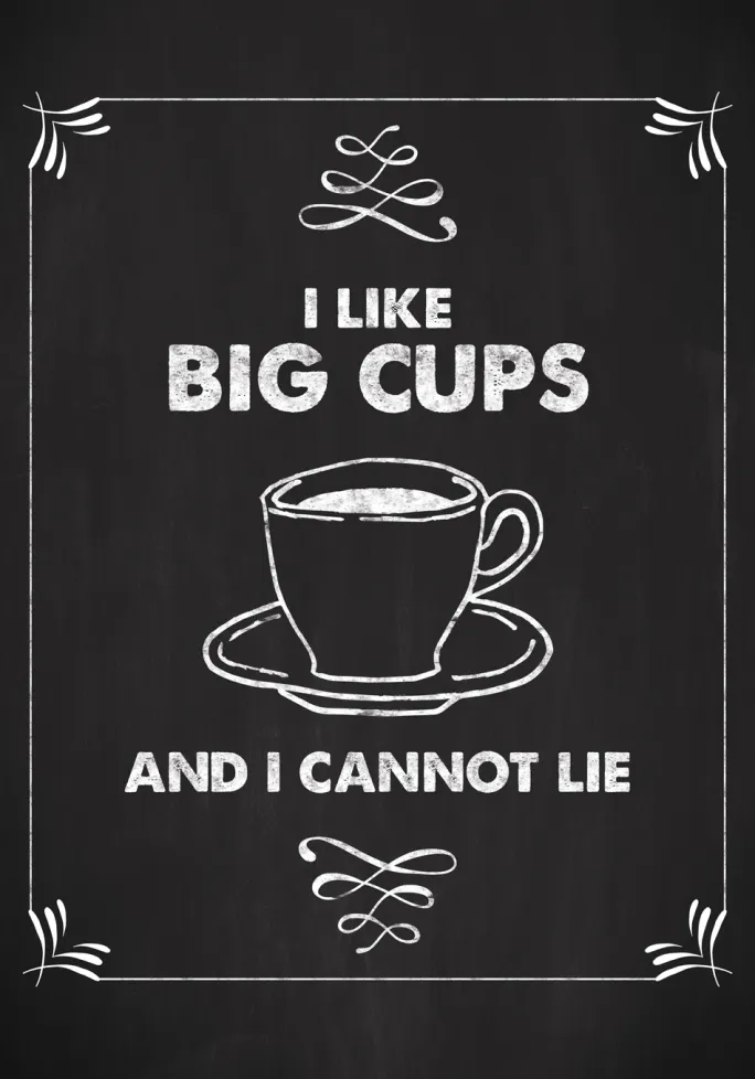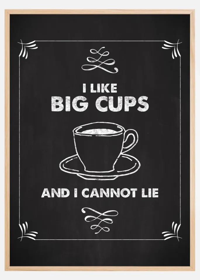 Sned plakat med budskabet – I like big cups, and I cannot lie, for den der kan lide store kopper kaffe eller te. Den sort-hvide poster, med følelsen af en tavle, gør sig godt på en hylde i køkkenet sammen med kogebøger og madlavningsaccessories. Eller hvorfor ikke hænge den sammen med andre grafiske posters på en billedvæg med et tema fra køkkenverdenen. Kompletter plakaten med en enkel sort ramme, der lader teksten tale og som forstærker indtrykket af en skoletavle.