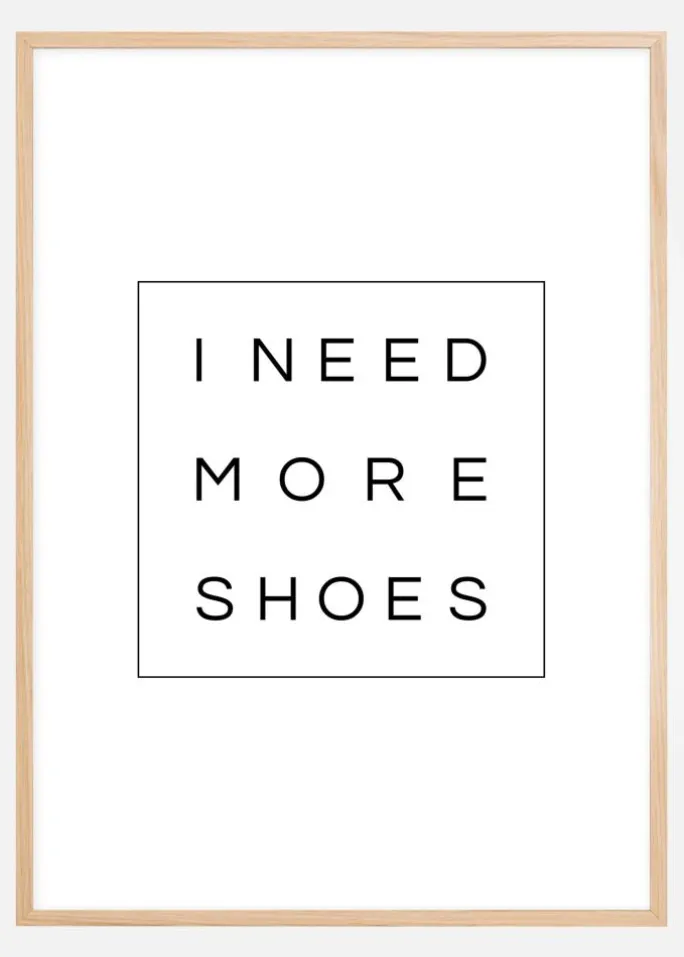 I need more shoes plakat trykkes i vores egen postersstudio på et 230 grams premium papir, som er FSC-certificeret og aldersbestandigt. Vi har valgt den kraftige tykkelse og matte overflade, fordi det giver et flot tryk uden refleksioner og har en kvalitetsfølelse. Eftersom vi selv trykker produktet, reduceres vores miljøpåvirkning desuden.