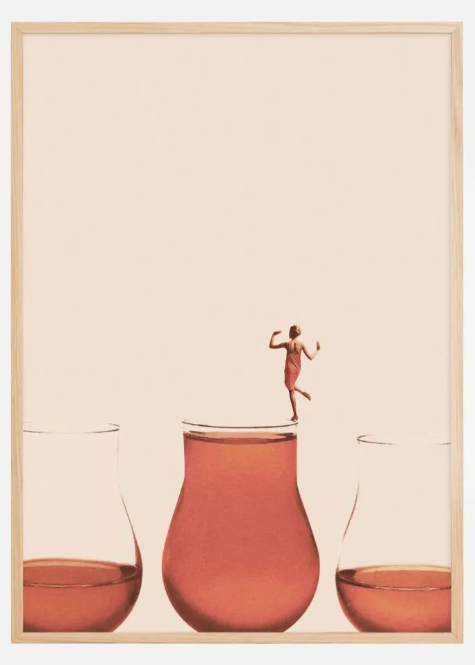 Denne kultiverede og æstetisk tiltalende plakat forestiller en kvindelig figur, der udfører en delikat balanceakt ovenpå kanten af et overfyldt vinglas. Kvinden, klædt i en kjole, synes at danse eller bevæge sig med en ædel ynde, et billede af kontrol og præcision i en handling, der kan virke risikabel. Hendes silhuet fremstår næsten som en metafor for den fint afstemte tilgang, der kræves for at nyde livets finere ting, med en balanceret værdsættelse af det fulde og det tomme.