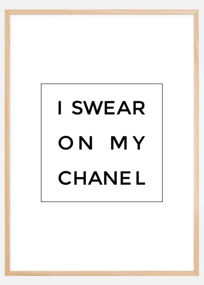 Hvis du sværger på din Chanel – ja, så ved alle, der virkelig kender dig, at du mener det alvorligt! Denne stilfulde plakat passer perfekt hjemme hos dig, som gerne omgiver dig med luksuriøse ting. Prints er hvid med et sort tryk i form af teksten “I swear on my chanel” indeni en tynd, dekorativ kvadrat. Det sort-hvide design gør sig fremragende sammen med en flot ramme i din yndlingsfarve. Posters findes i flere forskellige størrelser, så du nemt kan finde en, der passer lige til dit hjem.