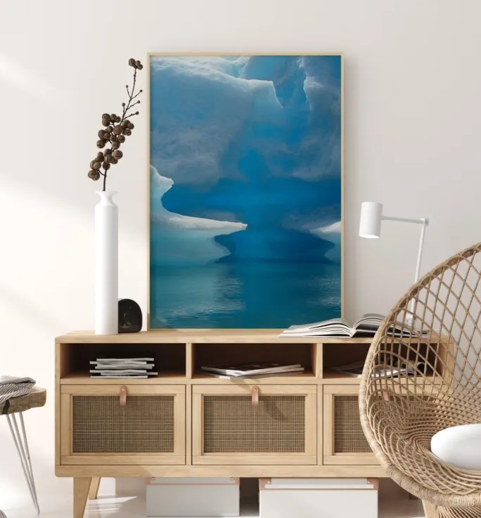 Et stille portræt af et krystalblåt isbjerg. Skarpe, hvide, kurvede isbjerge afspejler sig i det gennemsigtige hav. Den lyseblå himmel reflekteres i det dybe, kolde hav og skaber en iskold atmosfære. De forskellige blå nuancer vil lyse op i ethvert rum.