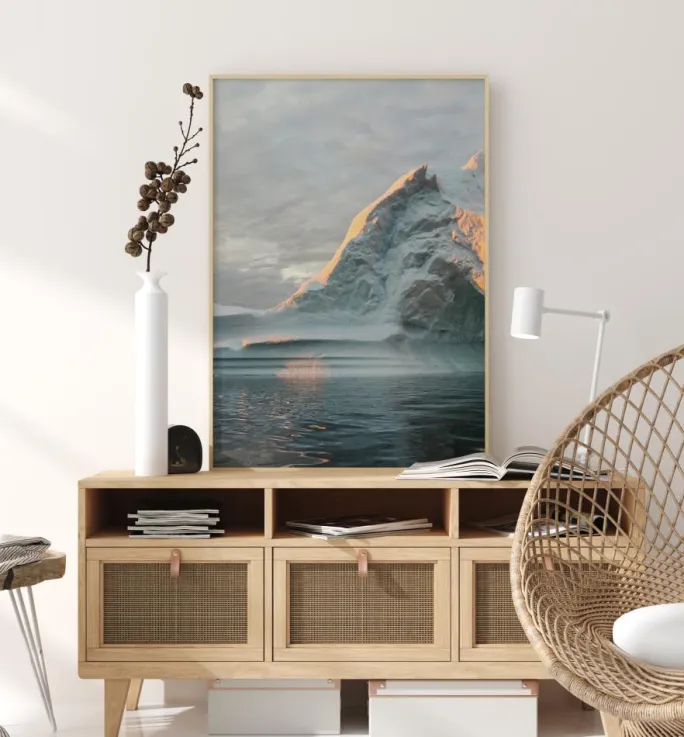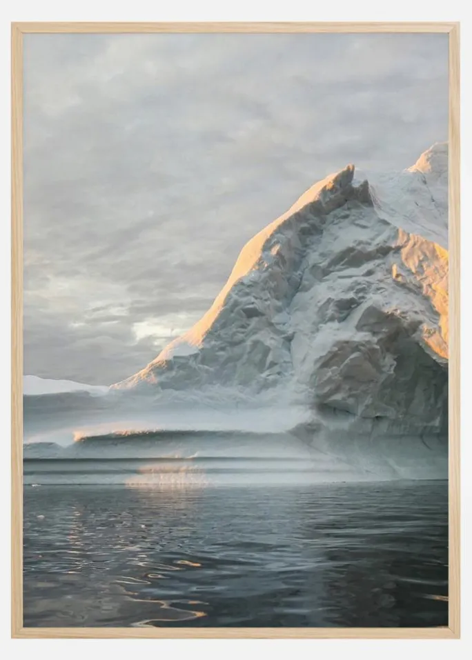 Dette betagende print af isbjerge reflekterer i det dybe, kolde hav mod en skyet, grå himmel. Det lille sneklædte bjerg er delvist oplyst af sollyset. Det krystalblå hav bølger blidt i forgrunden og skaber et fredfyldt billede. Et ideelt print til at hænge i din vinterhytte over pejsen.