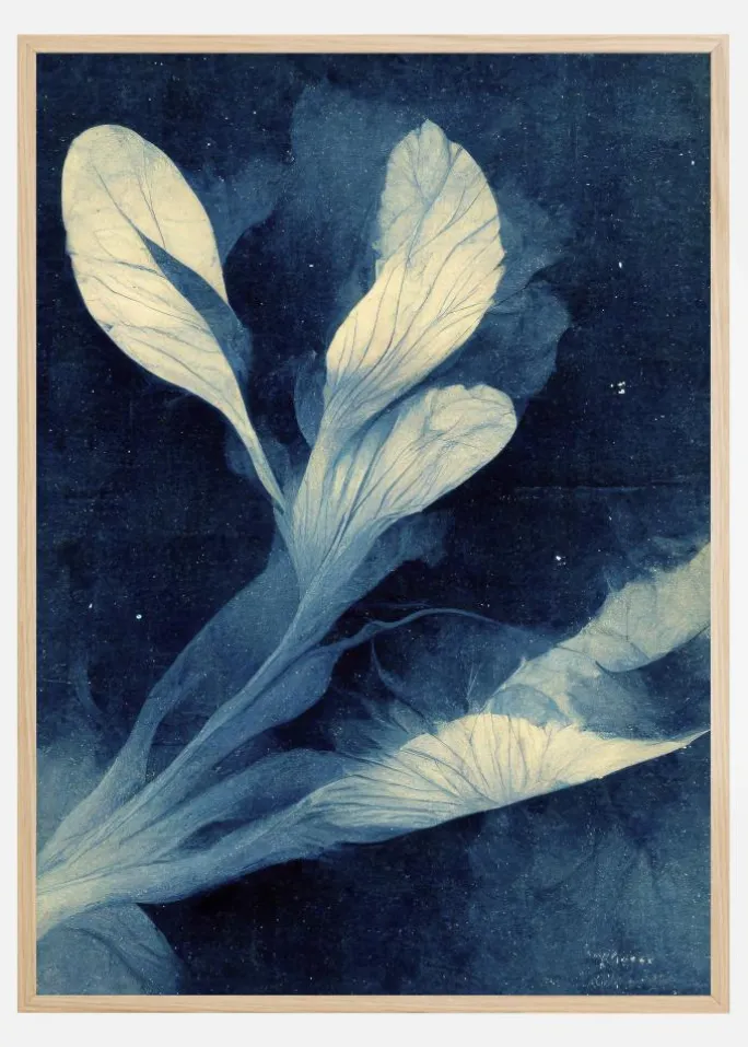 Denne plakat er en legemliggørelse af stilheden og mystikken i en midnatshave, med blege løv, der synes at svæve over en rig indigoblå baggrund. Den illustrerer skønheden i naturens enkle former, fremhævet gennem kontrasten af de næsten lysende blade mod en mørk himmel. Det er et kunstværk, der fortryller og beroliger, hvilket giver en følelse af dybde og eftertænksomhed.