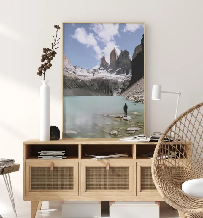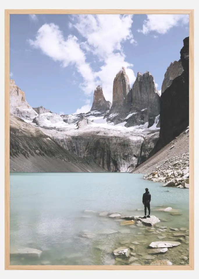 En naturplakat af en ensom figur, der observerer de betagende omgivelser. Stående på en sten ved søen omgiver de imponerende snedækkede bjerge en turkisfarvet sø. Du kan næsten mærke den kølige luft, der sendes fra dette magiske billede.