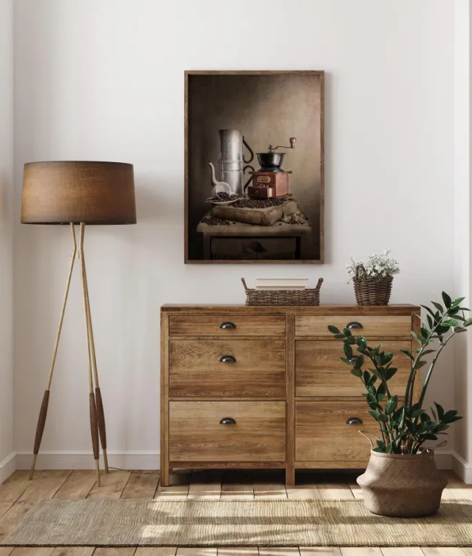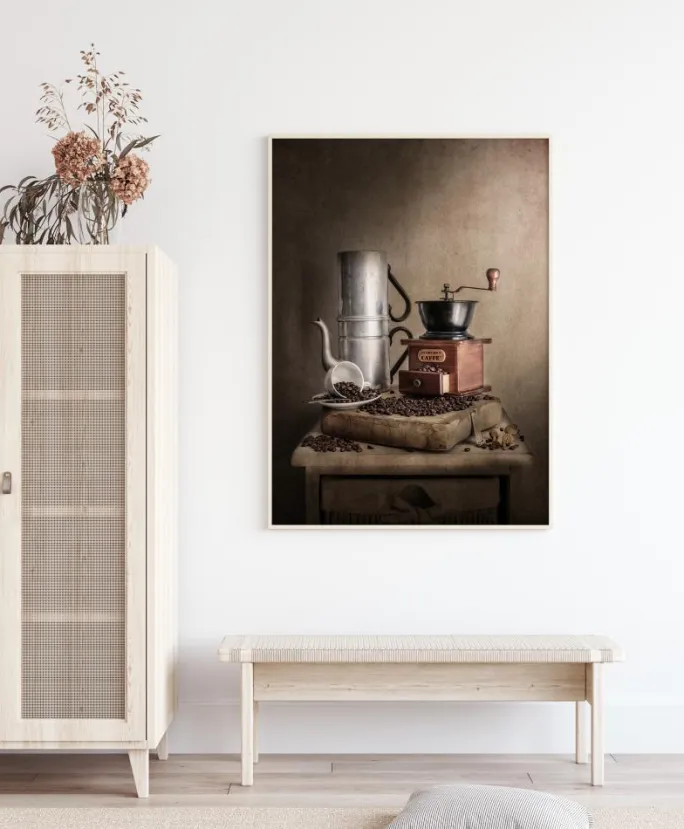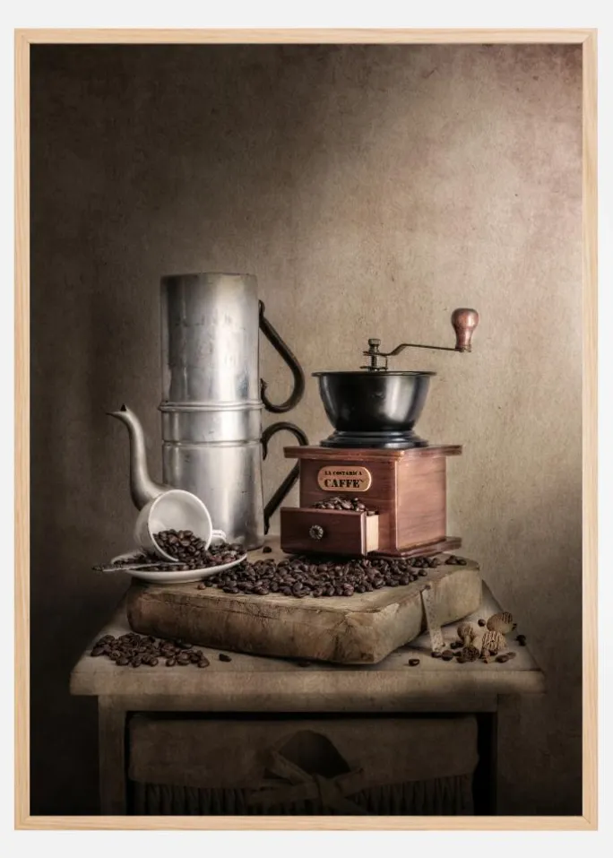 Et print med kaffetema med en kaffekværn, en kaffekande, kaffebønner og en hvid kop og underkop. De bløde brune toner i dette print skaber et afslappende billede, hvor du næsten kan dufte de vidunderlige ristede kaffebønner. Det perfekte billede til at hænge i et køkken.