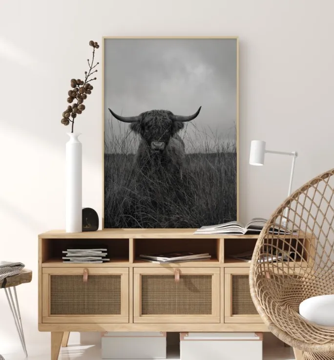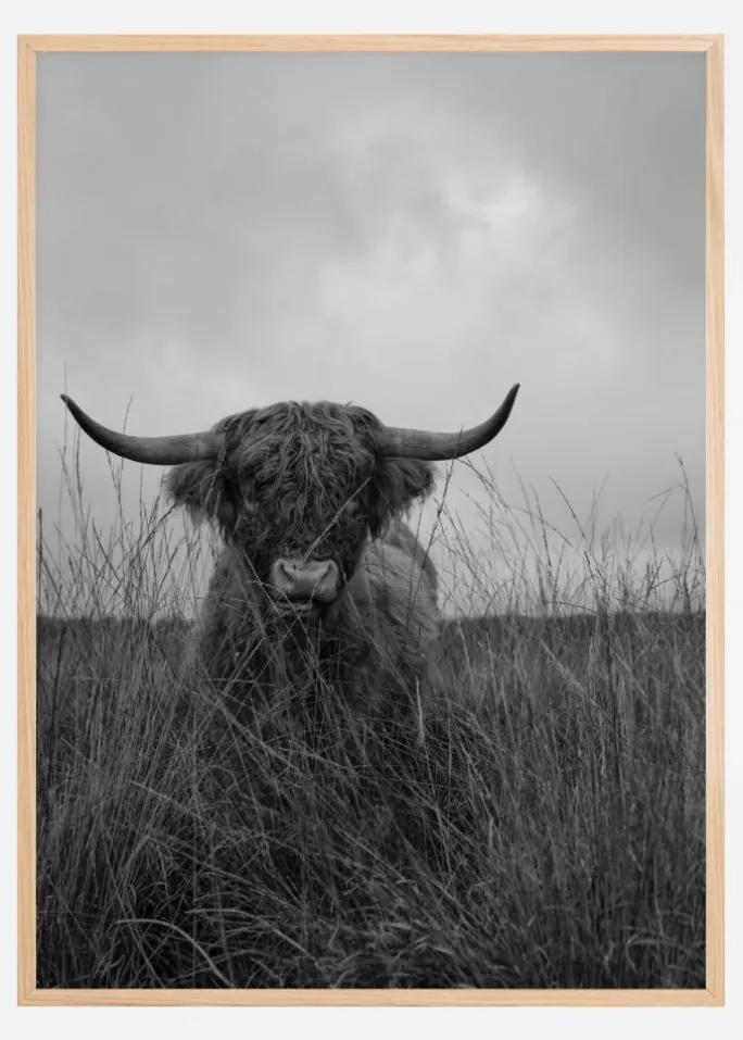 En bedårende plakat med en ensom højlandsko på en græsfyldt mark. Brug tid på at beskue denne ko, som står stolt mod den overskyede himmel. Nyd freden og tomheden med denne plakat.