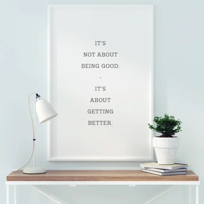 Et sort-hvidt motivationsbillede med et enkelt, men effektivt budskab. Det handler ikke om at være god, det handler om at blive bedre. Et simpelt budskab om opmuntring til at se livet roligt i øjnene med det formål at forbedre sig i de daglige gøremål. Et budskab om opmuntring til læseren.