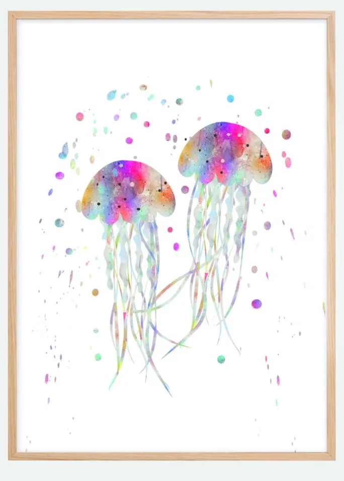 Et sjovt og kreativt print af to små flerfarvede vandmænd. Med deres farverige klokker og tentakler er de omgivet af farverige prikker, der er spredt tilfældigt ud på en hvid baggrund. Et dejligt portræt, der vil lyse op i ethvert rum i dit hjem.