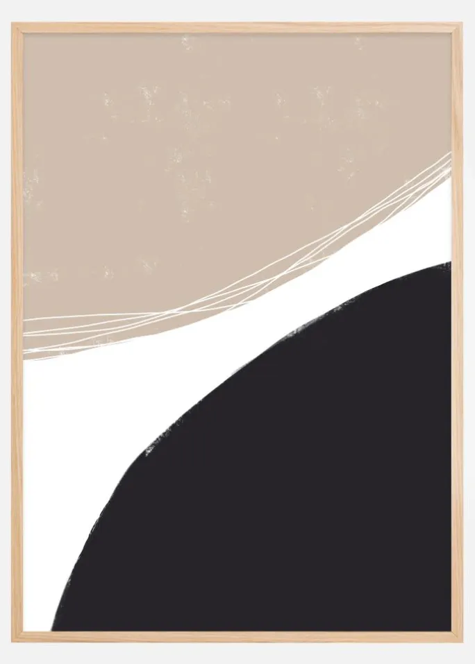 Denne minimalistiske og enkle plakat præsenterer en beroligende og balanceret komposition af kurvede linjer og organiske former. Den store, mørke form, der dominerer nederste del af billedet, giver en følelse af fundament og tyngde, mens de lysere linjer ovenfor tilbyder et blødt og dynamisk element, der står i kontrast til den mørke form. En neutral farvepalet i toner af beige og sort skaber en følelse af moderne elegance.