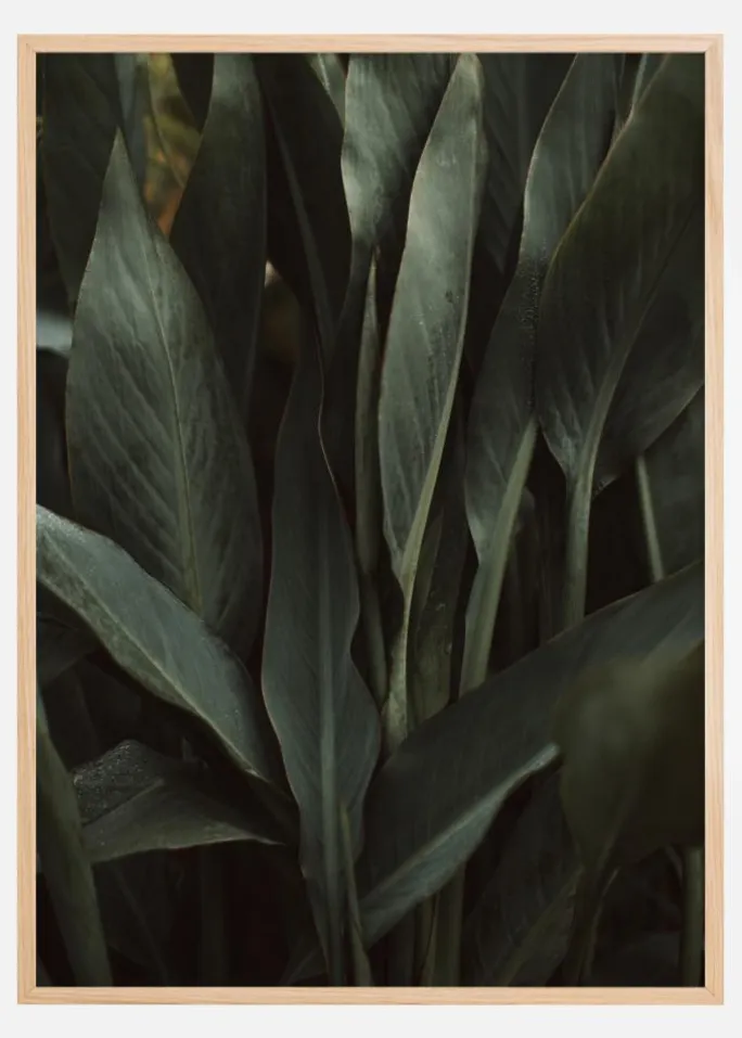 Træd ind i en verden af frodige grønne nuancer med denne levende plakat, der fanger dybden og mangfoldigheden af junglens vegetation. I denne nærbillede af planter kan man mærke den fugtige atmosfære og duften af frisk grønne. Plakatens rige palet af grøn er subtilt skiftende, fra mørkere bladgrøn til blødere mosgrøn, hvert blad er en leg med lys og skygge.