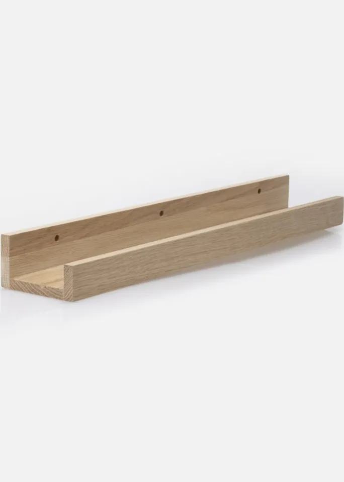 Med en praktisk billedhylde viser du dine billeder på en elegant måde og får desuden fremragende muligheder for at variere din vægkunst. Denne billedhylde er fremstillet i massiv eg og har et stilrent design med enkle, lige linjer. Selve hyldeplanet har en udfræset rille, der giver støtte til dine billeder og gør, at de får en flot vinkel, hvor de står skråt opad væggen. Billedlisten findes i flere forskellige længder, hvoraf denne variant har længden 120 cm. Billedhylden har også forborede huller, og for at gøre det hele endnu lidt enklere medfølger desuden passende skruer og plugs.