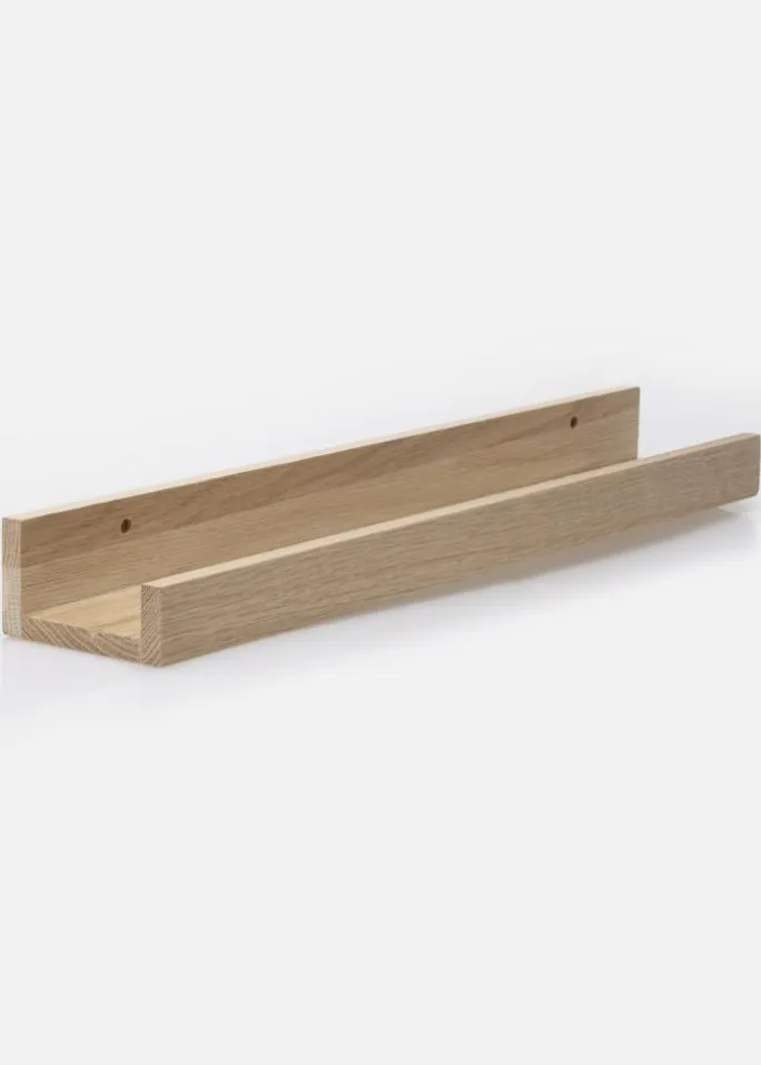 Med en praktisk billedhylde kan du fremvise dine billeder på en elegant måde, og du får desuden rigtig gode muligheder for at variere din vægkunst. Denne billedhylde er fremstillet i solidt egetræ og har et stilrent design med enkle, lige linjer. Selve hyldefladen har en udfræset rille som giver støtte til dine billeder og gør at de får en flot vinkel, når de står lænet mod væggen. Gallerihylden fås i flere forskellige længder, hvoraf denne variant har længden 30 cm. Billedhylden har også forborede huller, og for at gøre det hele endnu enklere medfølger også passende skruer og plugs.