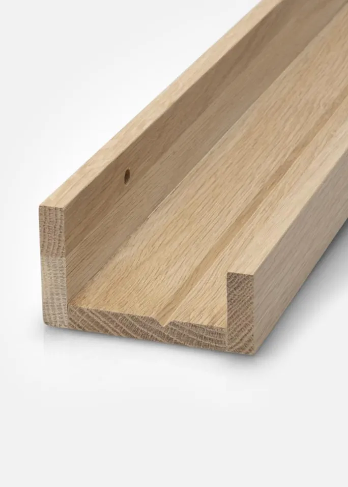 Med en praktisk billedhylde kan du fremvise dine billeder på en elegant måde, og du får desuden rigtig gode muligheder for at variere din vægkunst. Denne billedhylde er fremstillet i solidt egetræ og har et stilrent design med enkle, lige linjer. Selve hyldefladen har en udfræset rille som giver støtte til dine billeder og gør at de får en flot vinkel, når de står lænet mod væggen. Gallerihylden fås i flere forskellige længder, hvoraf denne variant har længden 50 cm. Billedhylden har også forborede huller, og for at gøre det hele endnu enklere medfølger også passende skruer og plugs.