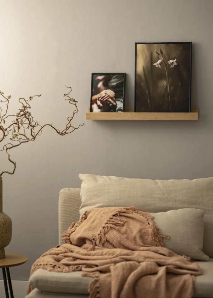 Da billedhylden er fremstillet i solidt egetræ, skal du være opmærksom på at der kan forekomme visse naturlige farvevariationer. Billedhylden er behandlet med en beskyttende transparent olie.