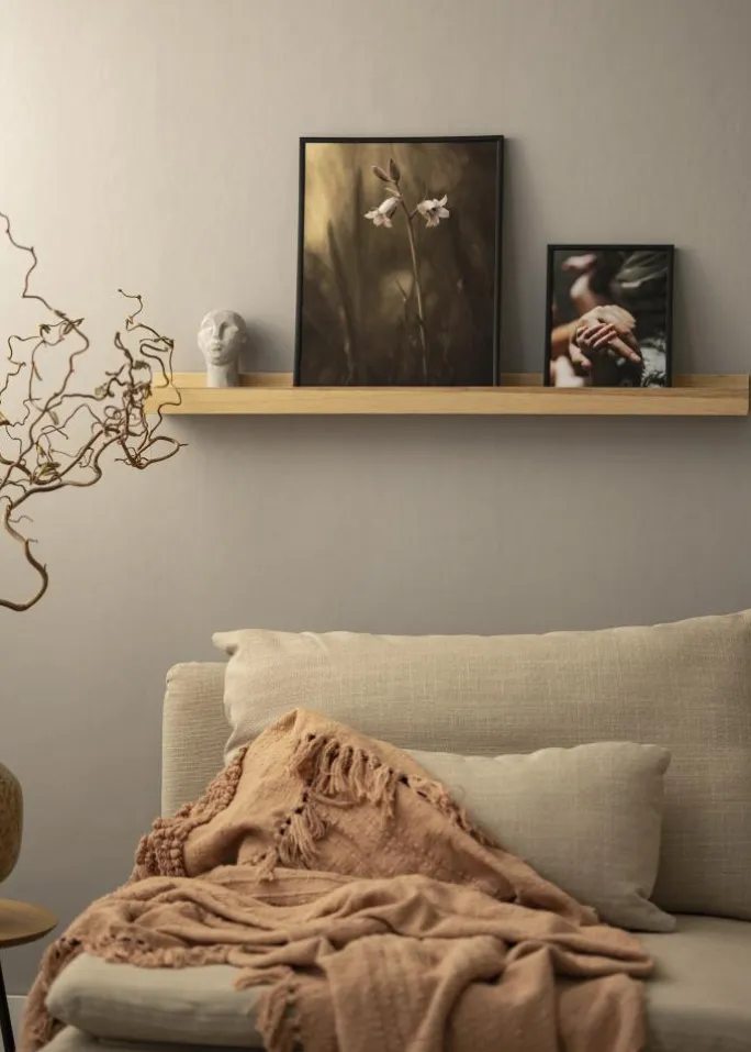 Da billedhylden er fremstillet i solidt egetræ, skal du være opmærksom på at der kan forekomme visse naturlige farvevariationer. Billedhylden er behandlet med en beskyttende transparent olie.