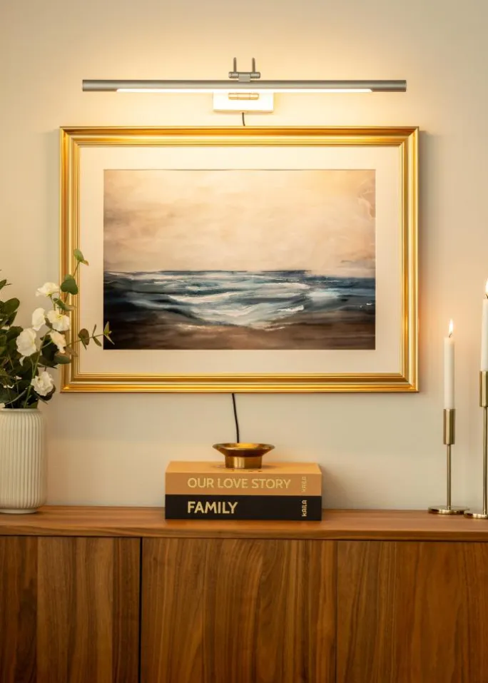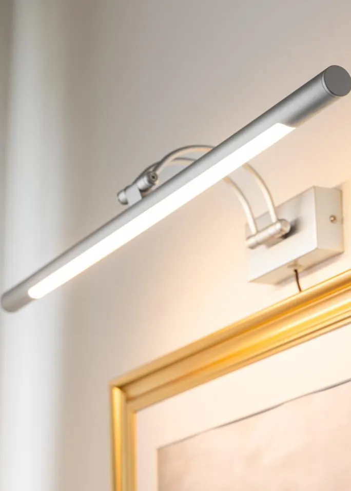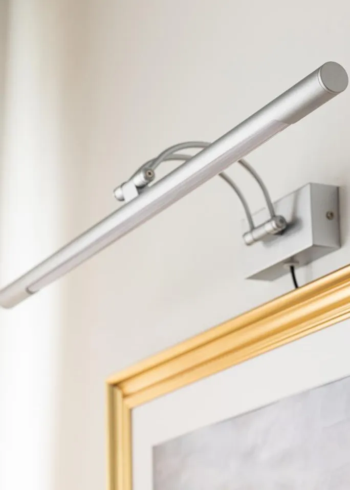 Denne stilfulde billedbelysning i sølv giver en subtil og elegant belysning for at fremhæve dine kunstværker eller fotografier. Med en dybde på 19 cm og en længde på 68 cm er den perfekt til at belyse kunstværker med en maksimal bredde på 110 cm. Belysningen har en indbygget LED-lyskilde som giver et behageligt varmt lys med en farvetemperatur på 3000K, hvilket fremhæver detaljer uden at skabe blænding eller skygger. Lysstyrken er på 780 lumen, hvilket giver en jævn og behagelig lysspredning over fladen.