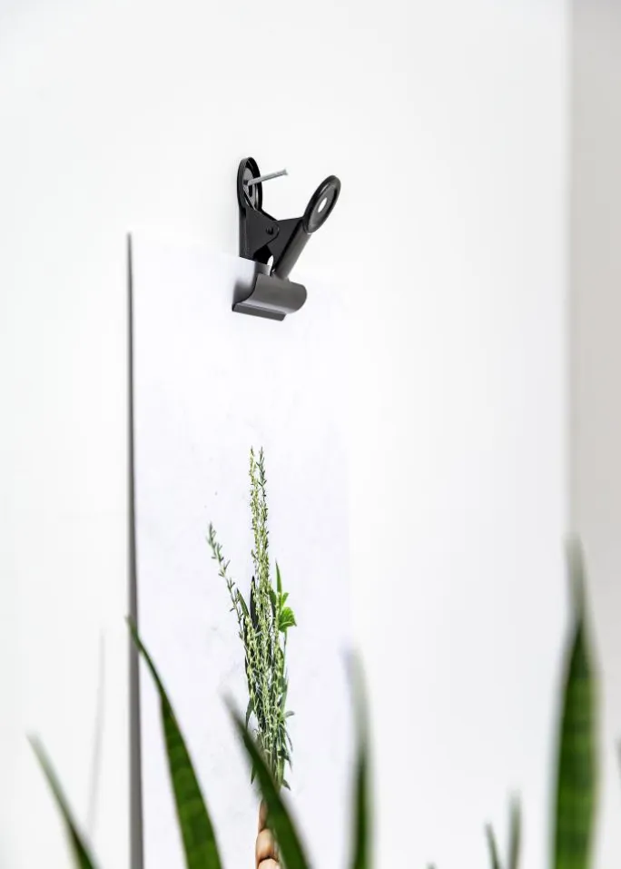 Denne sorte metalklemme har en flot mat finish og med denne klemme kan du hænge dine plakater og posters op på en elegant og smart måde. Klemmens åbning har et godt greb som gør, at du kan fastgøre selv det tyndeste papir, men det er også muligt at anvende klemmen til motiver med lidt kraftigere tykkelse. Har du en stor plakat som du vil hænge op, kan du vælge at anvende to posterklemmer. Metalklemmens design er stilrent, og hullerne i klemmens runde top gør det enkelt og let at hænge den på væggen med et lille søm eller skrue.