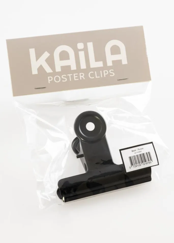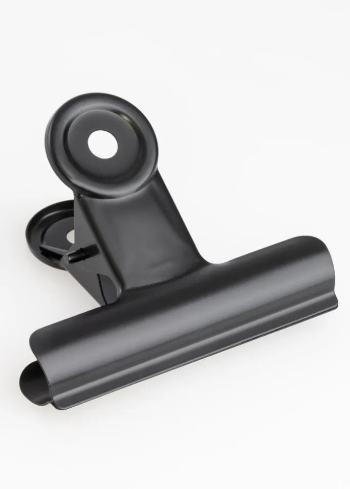 Denne sorte metalklemme har en flot mat finish og med denne kan du hænge dine plakater og posters på en elegant og smart måde. Klemmens åbning har et godt greb som gør at du kan fastgøre selv det tyndeste papir samtidigt som det også er muligt at anvende klemmen til motiver med lidt kraftigere tykkelse. Har du en stor plakat som du vil hænge op, kan du vælge at anvende to posterklemmer. Metalklemmens design er stilrent, og hullerne i klemmens runde top gør det enkelt og let at hænge den på væggen med et lille søm eller skrue.
