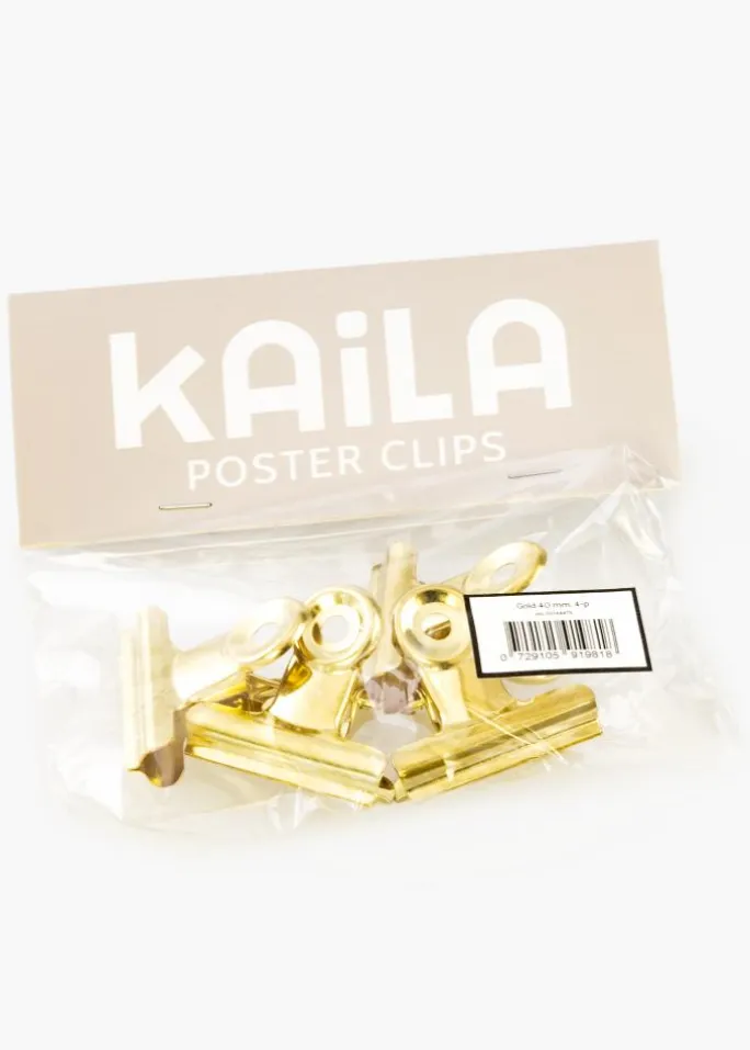 En metalklemme i en elegant og blank guldfinish som giver mulighed for at hænge dine plakater og posters op på en smart og enkelt måde. Posterklemmens design er stilrent, og hullerne i klemmens runde top gør det enkelt at hænge den på væggen på et lille søm eller en skrue. Klemmens åbning har et godt greb som gør at du kan hænge selv det allertyndeste papir op, samtidigt som den også er fleksibel og muliggør montering af motiver i varierende tykkelse. Har du en stor plakat som du vil hænge op, så kan du anvende to metalklemmer for bedste resultat.