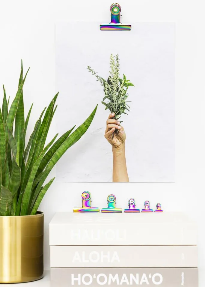 En flot regnbuefarvet metalklemme i en blank finish som gør det muligt at hænge dine plakater og posters op på en smart og lidt anderledes måde. Posterklemmens kraftige, men fleksible, åbning gør, at du kan fastgøre det allertyndeste papir såvel som plakater som er lidt tykkere. Har du en stor plakat, som du vil hænge op, så er det bare at anvende to metalklemmer. Posterklemmens design er stilrent og enkelt, og takket være hullerne i klemmens runde top kan du nemt hænge den op væggen ved hjælp af et lille søm eller en skrue.