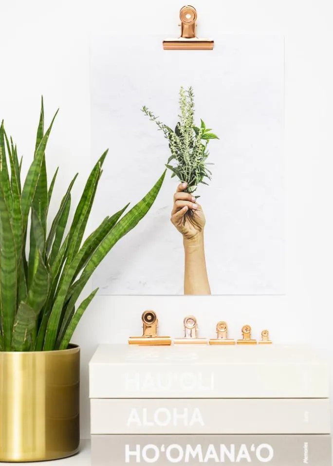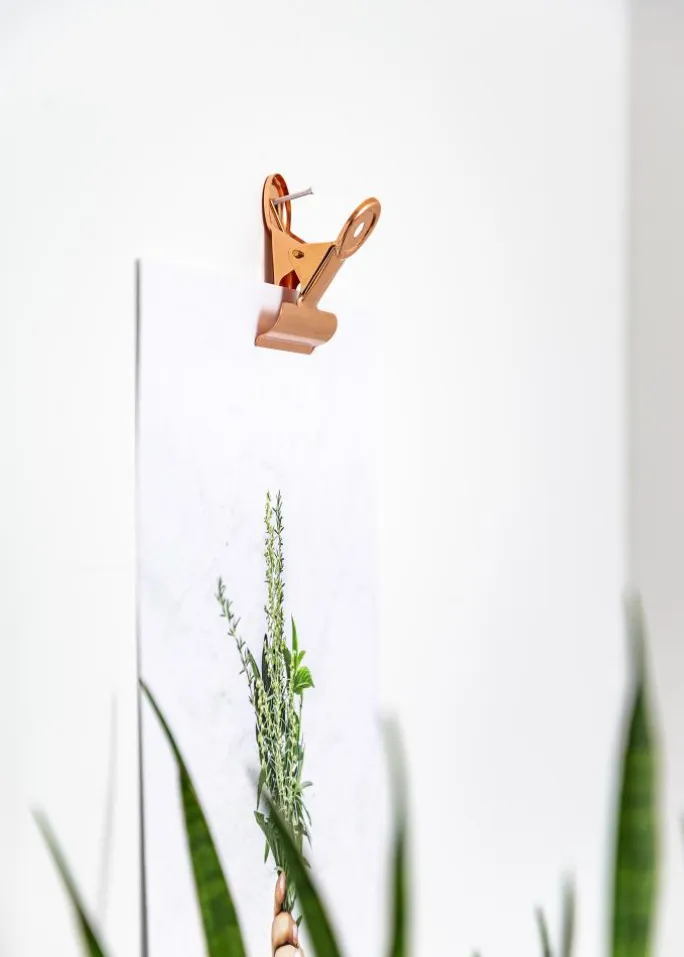 Denne metalklemme har en flot og blank finish i trendfarven roséguld og er perfekt, hvis du vil hænge din plakat op på en lidt mere moderne måde. Designet er stilrent, og hullerne i posterklemmens runde top gør den enkel at hænge på væggen med et lille søm eller en skrue. Klemmens åbning har et fleksibelt, men fast greb, som gør, at du kan fastgøre såvel supertyndt papir som posters i lidt kraftigere tykkelse. Og vil du hænge en større plakat op på denne måde, er det bare at anvende to metalklemmer.