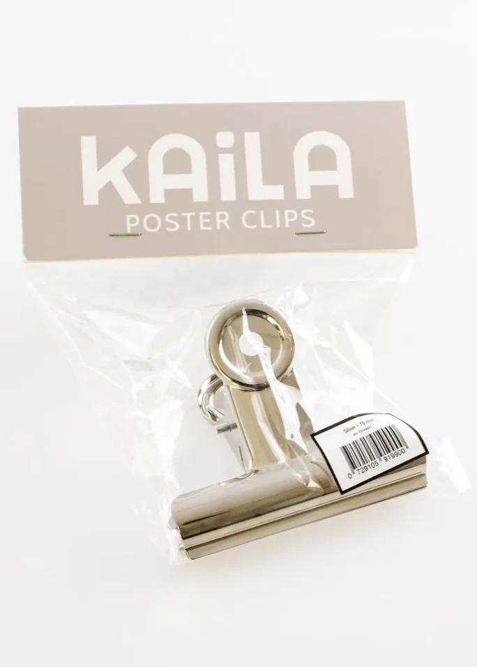 Denne metalklemme har en moderne og blank sølvfinish, og det er det perfekte værktøj som giver mulighed for at hænge dine plakater og posters op på en smart og enkel måde. Klemmens fleksible og gode greb gør at du kan hænge motiver med varierende tykkelse op, selv det allertyndeste papir. Hvis du har en stor plakat, anvender du bare to metalklemmer. Posterklemmens design er enkelt og stilrent, og hullerne i klemmens runde top gør monteringen på væggen enkel og let – alt du behøver er et lille søm eller en skrue.