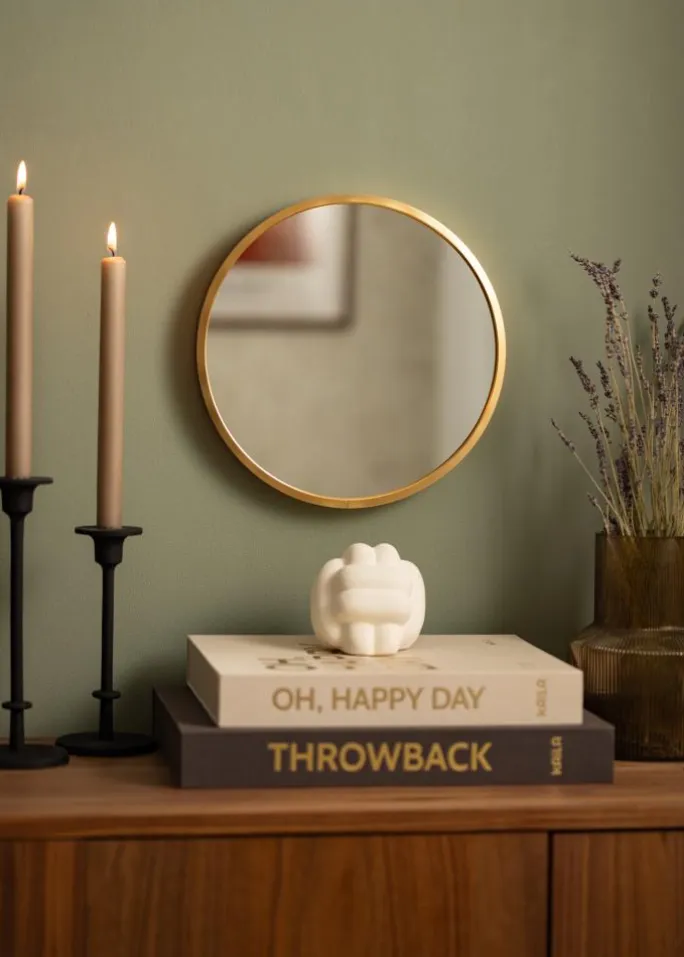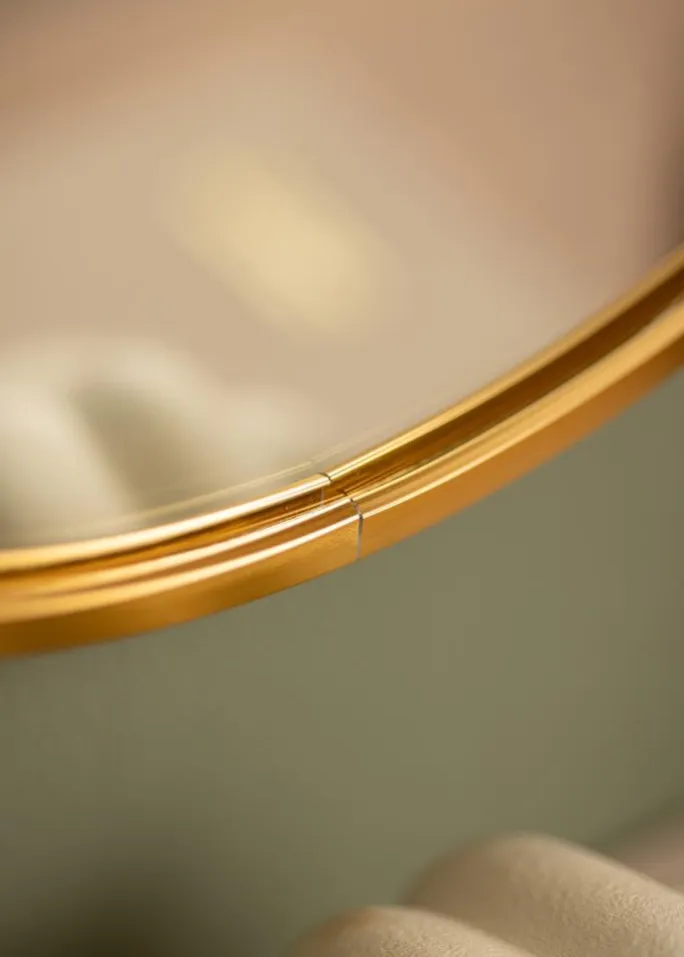 - Rundt spejl med dyb ramme i guldfarvet metal