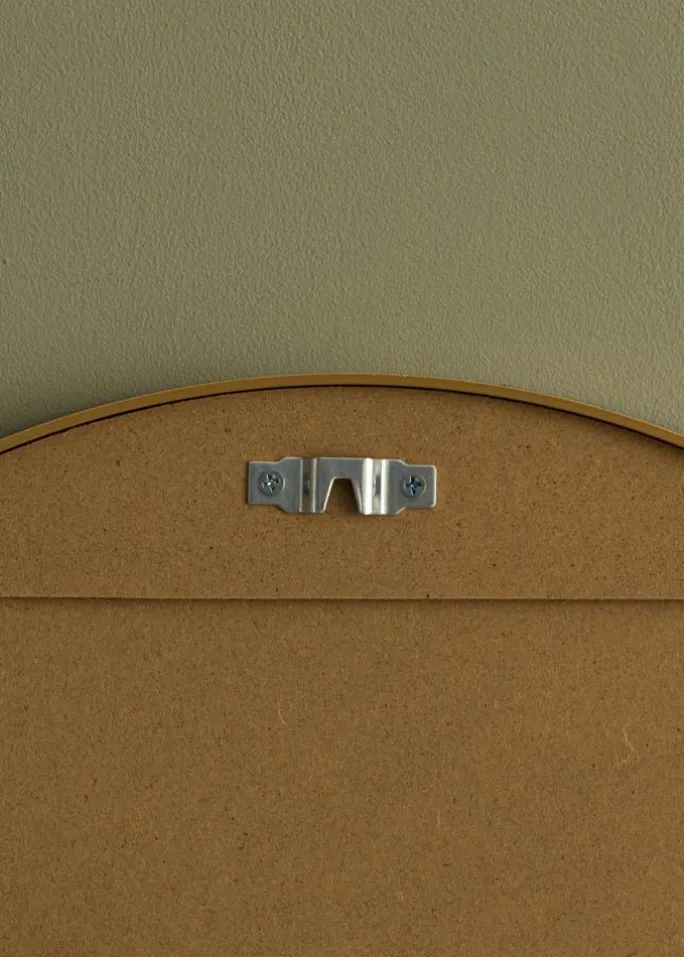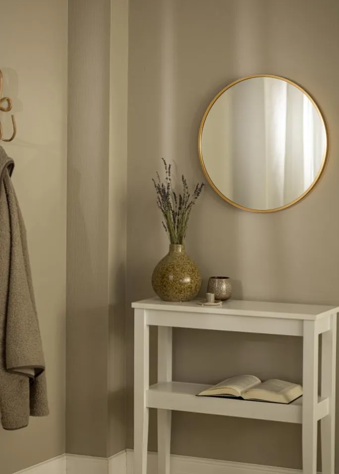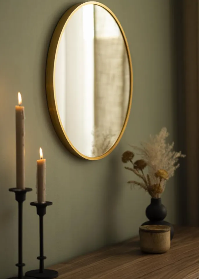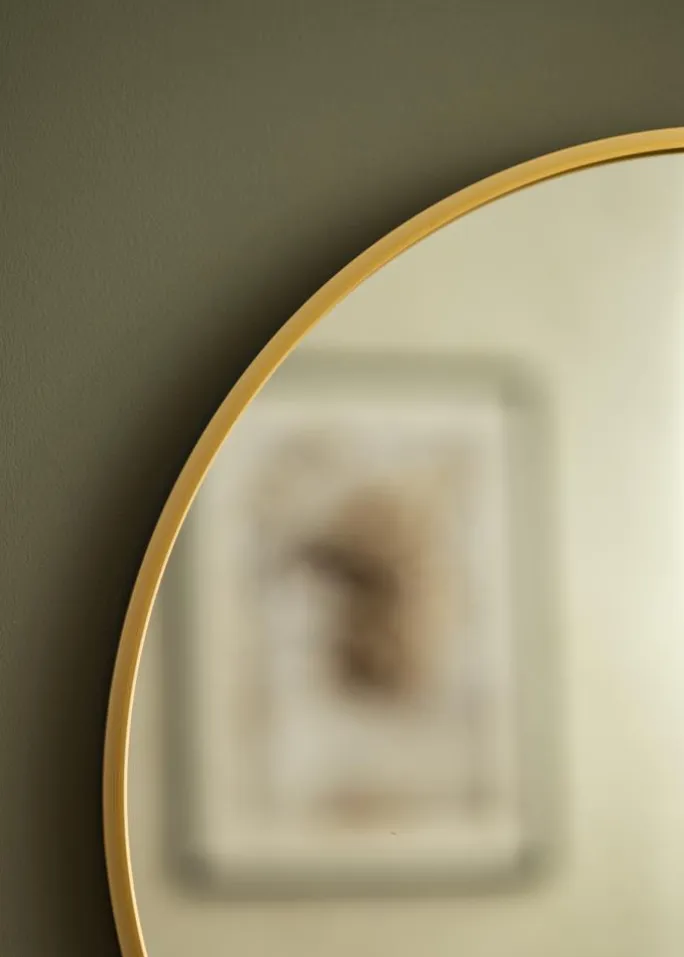 - Rundt spejl med dyb ramme i guldfarvet metal
