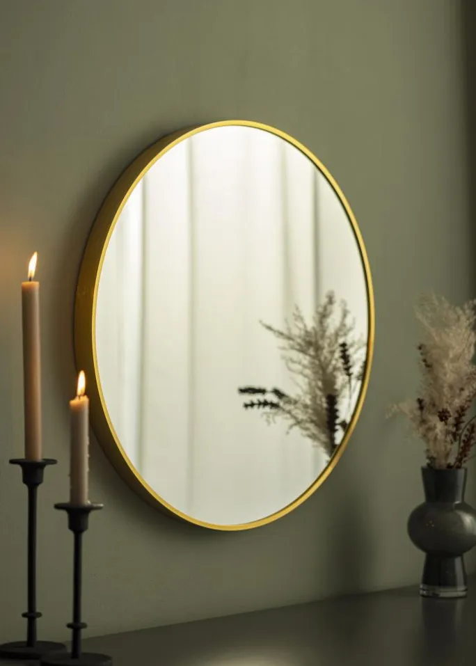 - Rundt spejl med dyb ramme i guldfarvet metal
