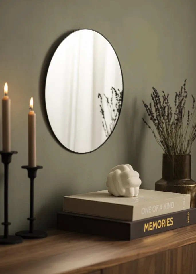 - Rundt spejl med stilren sort metalkant
