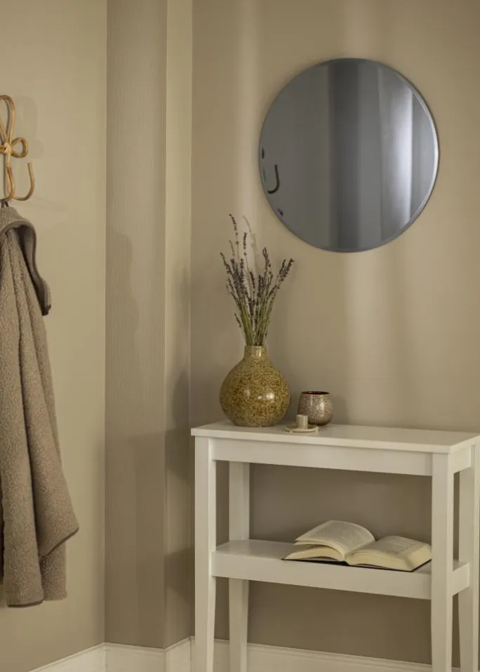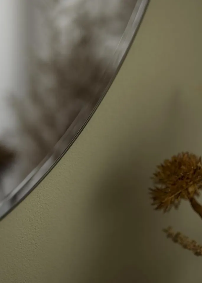 Et spejl med tonet spejlglas er en flot indretningdetalje der udtråler karakter. Dette er en rund variant med gråtonet glas – en mere afdæmpet nuance som giver et luksuriøst, hotellignende udtryk. Den grå farve passer godt i hjem som er indrettet i en lidt mørkere stil, man kan også udgøre en flot kontrast på lyse vægge. Dette vægspejl reflekterer lys som et almindeligt spejl, men i en blødere lystone.