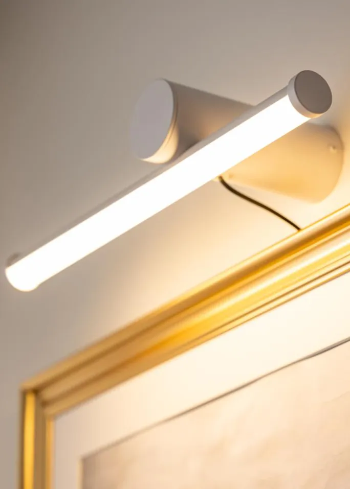 Med sit rene og moderne hvide design er denne billedbelysning et diskret og stilfuldt alternativ for at fremhæve dine malerier eller fotografier. Lyset spreder sig blødt og jævnt over kunstværker op til 80 cm i bredde, hvilket gør den til en alsidig løsning for både hjem og kontor. Med sine mål på 40 cm i længde og 15,3 cm i dybde er belysningen tilpasset til at sidde flot over billedet uden at trække for meget opmærksomhed fra kunstværket.