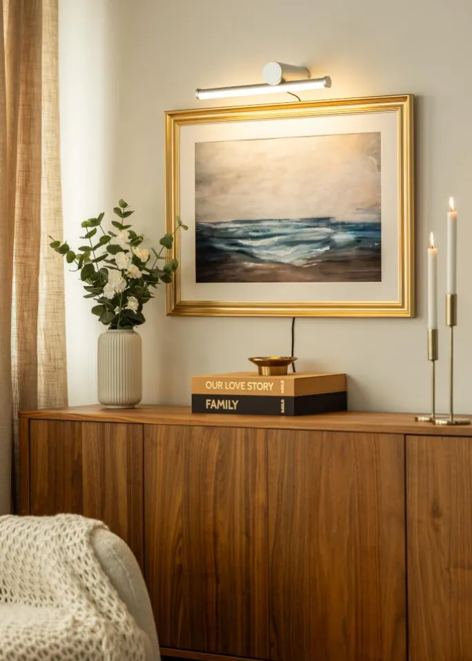 Med en farvetemperatur på 3000K giver denne belysning et varmt, men alligevel naturligt lys, hvilket fremhæver detaljerne i dine kunstværker uden at være påtrængende. Den integrerede LED-lyskilde har en lysstyrke på 520 lumen, hvilket giver tilstrækkeligt med lys til at dække malerier op til 80 cm i bredde, samtidig med at energiforbruget holdes lavt takket være den moderne LED-teknologi.