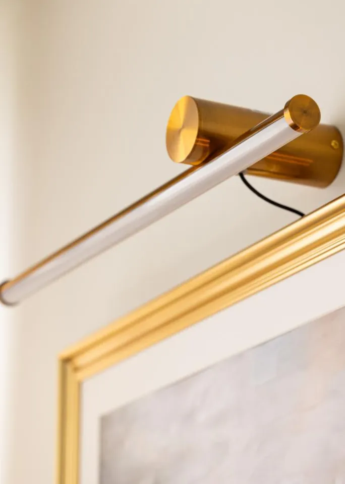 Denne billedbelysning er ikke kun en praktisk løsning til at belyse dine kunstværker, men fungerer også som en dekorativ detalje i sig selv. Med sit diskrete men stilfulde design i messing bliver den en elegant indramning for både moderne og klassiske kunstværker. Uanset om du har et stort billede, der kræver fokus, eller en mindre kunstinstallation, vil denne belysning give det rette lys og fremhæve dine værker på bedste vis.
