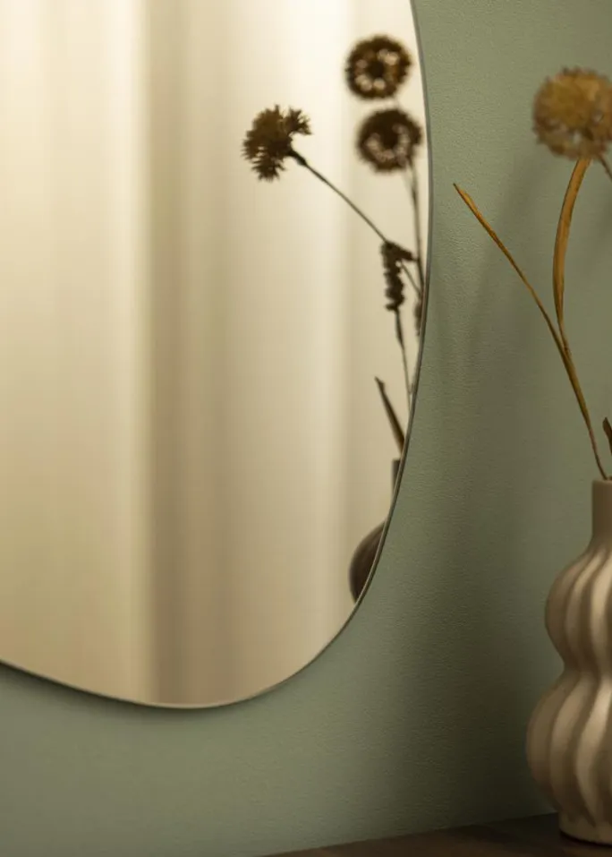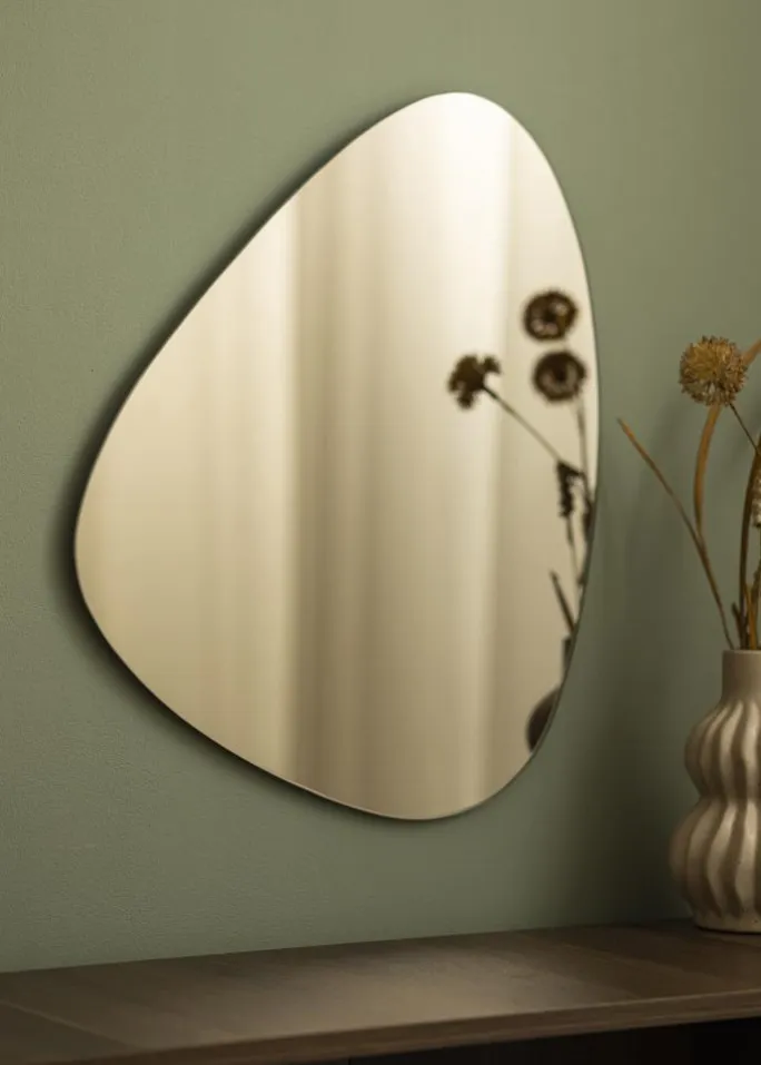 Oplev den unikke charme ved vores moderne og organisk formede spejl, perfekt til at tilføje en touch af naturens blødhed til dit hjem. Med sine bløde linjer og naturlige konturer minder spejlet om en glat sten eller et vanddråbeformet blad, hvilket skaber en harmonisk atmosfære i ethvert rum.