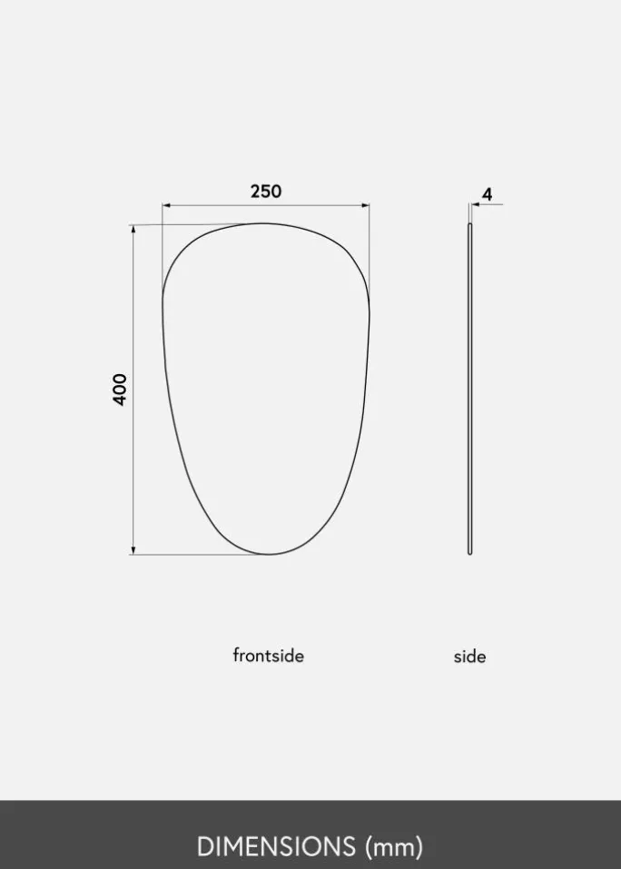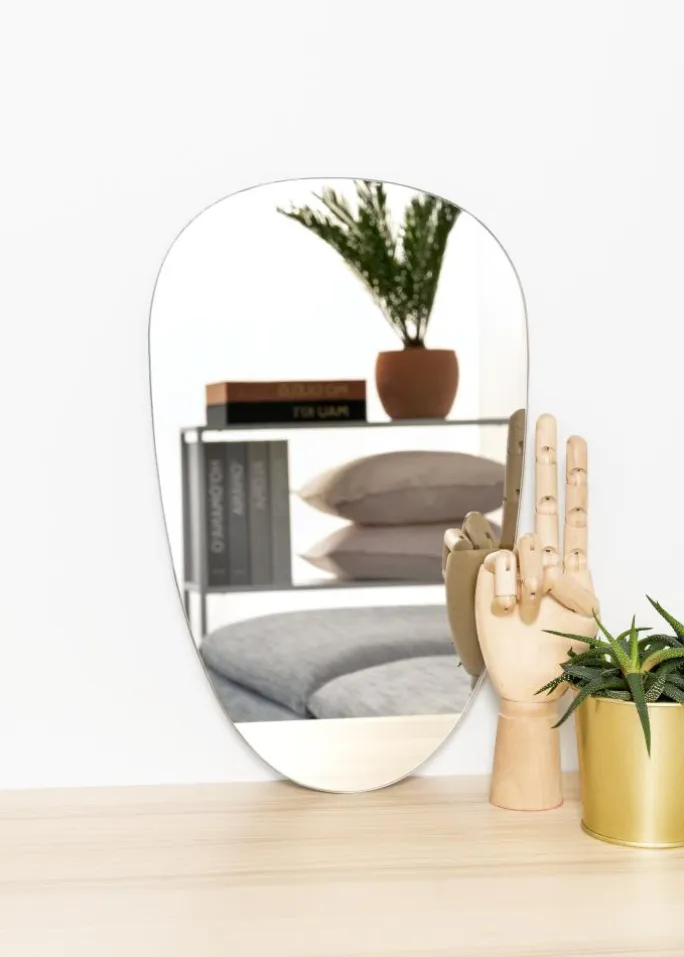 Du får her et spejl med en spændende og lidt anderledes form, som vil gøre et trendy indtryk i dit hjem! Derudover måler dette asymmetriske spejl kun 4 mm i tykkelsen og har ingen ramme, hvilket giver det en meget delikat og elegant fremtoning.