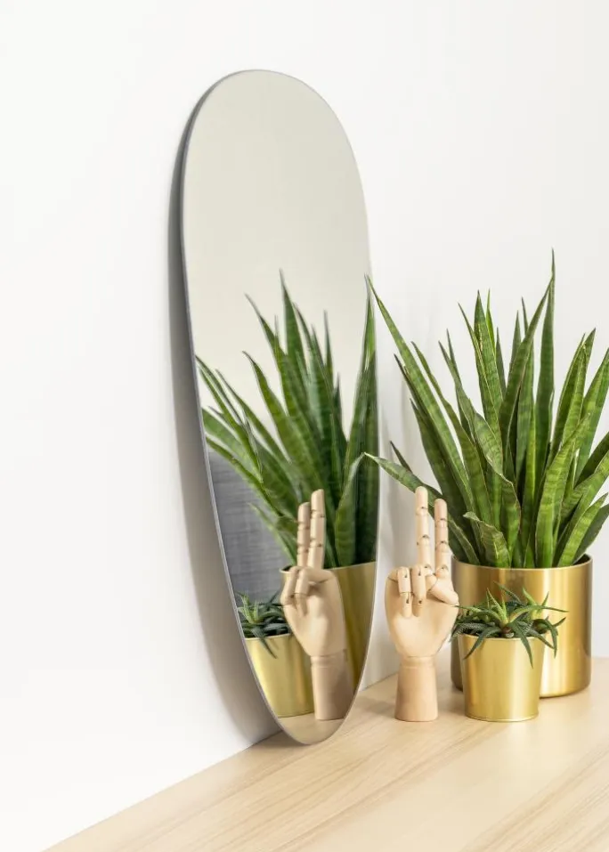 Et stilfuldt og interessant spejl som dette bliver et moderne indslag i din boligindretning! Spejlet har en blød og asymmetrisk form, der nærmest kan beskrives som ujævnt oval. Spejlet er desuden meget tyndt og har ingen ramme, hvilket forstærker spejlets elegante fremtoning.